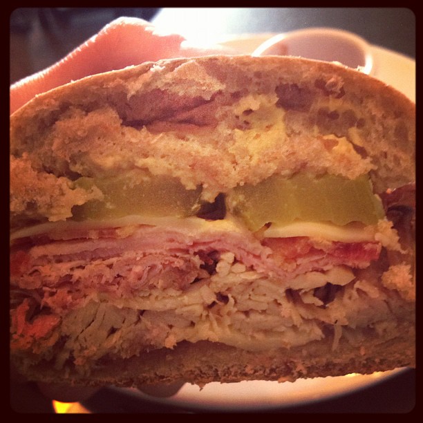 Pulled pork, ham, bacon, swiss cheese, dijon mustard, and house made pickles make this sandwich oh so delicious.