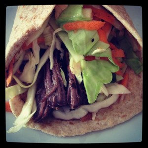 I’ve tried this recipe with pork loin roast too. It’s tasty either way. The local cabbage adds such a fresh crunch and peppery bite. This meal is one of those recipes that will make going local, all the way, all the time very difficult. Hoisin sauce is not local (obviously), neither are the wheat tortillas I usually buy. I’m sure I’ll come up with a solution or a cheat before June 4!