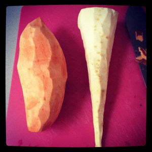 I peeled the uber-local parsnip Valerie gave me, and also one sweet potato I had in the pantry.