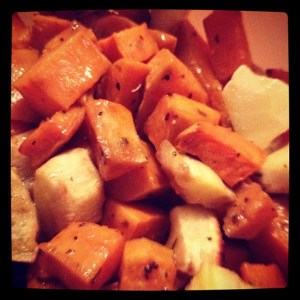 I chopped these beauties into about 1/2 inch pieces before tossing them in olive oil, salt, pepper, and a couple generous pinches of herbs de Provence. They spent about 20 to 25 minutes in a 425 degree oven. I’m not too exact on the time because I always keep checking them after 15 minutes or so.