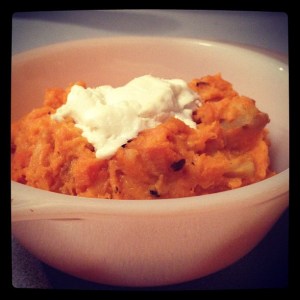 After smashing the roasted parsnip and sweet potato roughly (if you want a more “refined” consistency put them in a blender or food processor) I added a couple large spoonfuls of the plain yogurt, and gave it all one final smash and mix.
