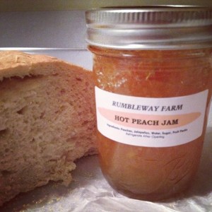 Another exciting accolade I received recently (I sound so “braggy”) was in the form of a fresh-baked loaf of bread and a jar of hot peach jam from Rumbleway Farm. Yes, you read that right. Hot. Peach. Jam. As in sweet peach jam with the warm, smooth heat of jalapeno. (And that, my friends, was a fragment. I do that sometimes. For effect. See? Sorry, Rogers!) My friend, Anita, gave me these gifts after hearing of my love for Rumbleway Farm. She attached a note that included the words, “P.S. I love your blog!” Yummy, yummy accolades. Thank you, Anita!