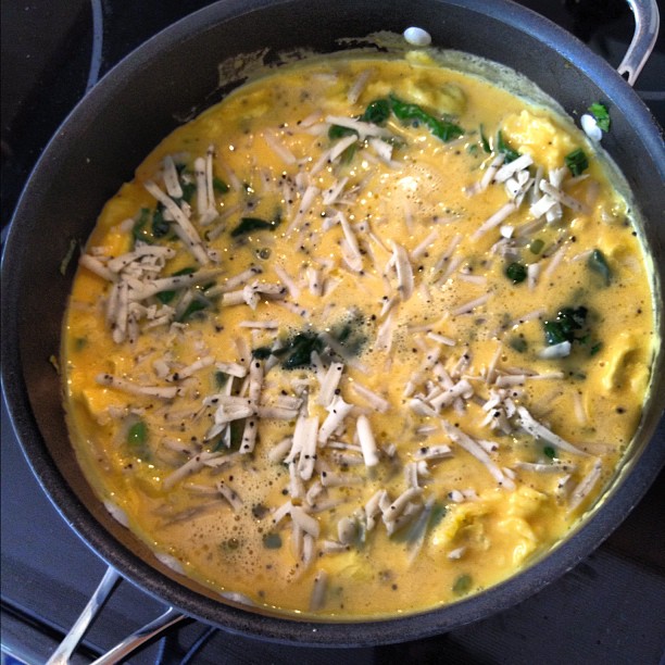 After I beat the eggs (with half and half, kosher salt and black pepper), I poured them into the skillet over medium heat. Then I left them alone and waited for the frittata goodness to take form. When making a frittata, don’t disturb it too much; allow it to cook on its own. In the beginning of the cooking process, I lift the edges slightly with a spatula to coax uncooked egg underneath, but that’s it. Once the bottom set and the top began to set, I sprinkled a generous portion of sharp white cheddar on top (I prefer goat cheese, but alas, I didn’t make it to the farmer’s market last weekend to stock up on local dairy products).