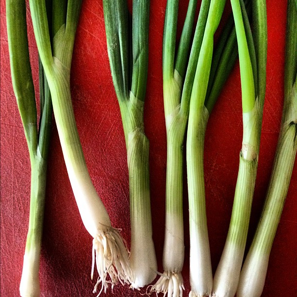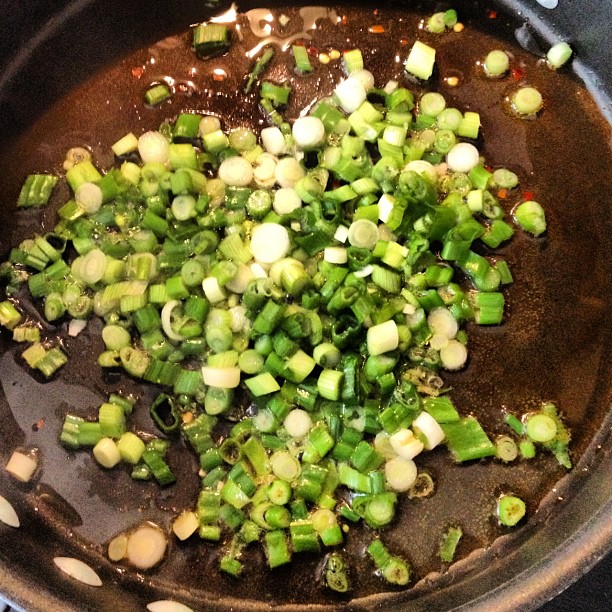 Into my skillet went some olive oil and a couple pinches of red pepper flake. The green onions followed.