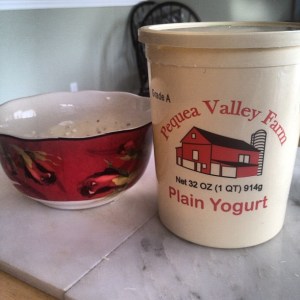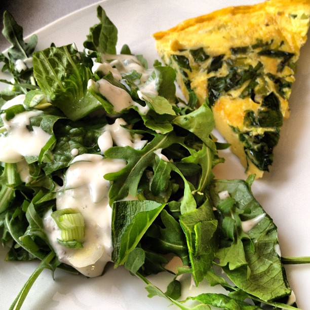 I usually turn the frittata out on a plate, but you don’t have to. Just slice it right from the pan. This is so good served with a side salad. I made my salad with the romaine from John’s garden and arugala. I wanted a dressing that was tangy and garlicky so I concocted my own from my favorite Pequea Valley Farm Yogurt. Yogurt, kosher salt, black pepper, garlic, and some honey make a creamy, perfectly tangy dressing.