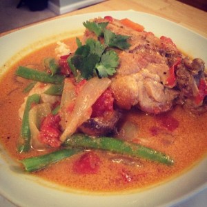 Monday I hit a blogging milestone. Fifty posts! In celebration, I decided to cook one of my favorite dishes. Off to the store I went to buy coconut milk and diced tomatoes. Everything else waited for me in the pantry and fridge. I know what you’re thinking. . .coconut milk and store-bought canned tomatoes are NOT LOCAL. This is true. BUT if you notice the countdown on the right, I am not going strictly local for 19 more days. Until then I am eating local as best I can. Many local items went into my cast iron pot tonight, including local turkey. I usually use chicken, but when all was simmered and sauced, I liked the turkey better; the flavor was deeper and more robust.