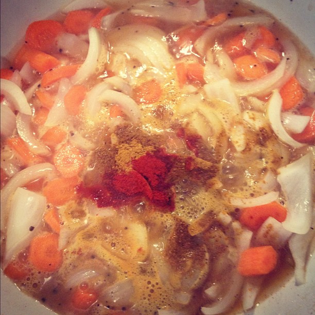 Remove the seared turkey to a plate for the time being. Pour the chicken broth in the pot, being sure to scrape up the yummy bits on the bottom with a wooden spoon. Add the garlic, red pepper flakes, onion, carrots, mushrooms, curry powder, smoked paprika, and fish sauce.