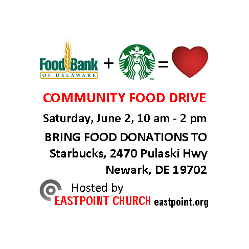 For all you locals out there, join my church, Eastpoint, for a Community Food Drive to benefit the Food Bank of Delaware. Close to 242,000 Delawareans turn to emergency food assistance each year. With that in mind, Starbucks in People’s Station (2470 Pulaski Hwy, Newark, DE 19702) kindly agreed to host the event with us. The Starbucks and Eastpoint staffs are gearing up for a big turnout. You can bring your non-perishable food donation directly to the main drop off location at Starbucks (you can even drive up–don’t even have to get out of your car!) or to any of these participating stores in People’s Plaza: