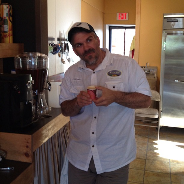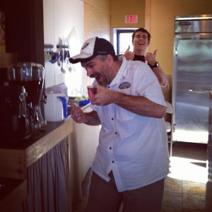 I settled on two cheeses–the local Italian Colby and the Balsamic BellaVitano. Even though the Balsamic isn’t local (in all fairness to me, this outing was before my all local diet began on June 4), I can never resist a nutty, fruity, and savory-sweet cheese. Before I left, Chris offered me some espresso, perfectly sweetened with sugar (one lump for me, two for him). While he made me the exceptionally good (and Italian) espresso, I didn’t have to coerce him too much to pose for a few photos. (Would you like some ham with your cheese?)