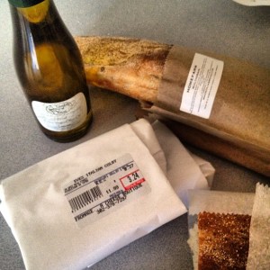 The husband and I walked out of Fromage weighted down with bread, cheese, olive oil, and an extra gift from Chris–a sandwich of sorts with manchego cheese, multi-grain bread, balsamic vinegar, and local honey. I couldn’t wait to get home to enjoy my bounty with a glass of red wine.