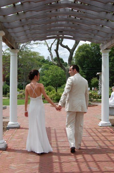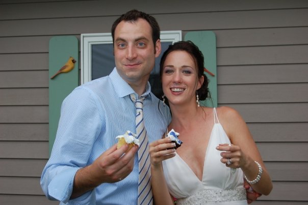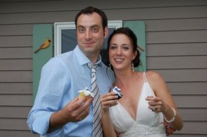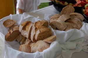 So with a simple backyard barbecue in mind, I set out to plan the menu, using the restaurants and coffee shops we visited on a regular basis for inspiration. Our friend Jimmie (Dr. James A. Hebda now, smartypants) grilled chicken for everyone with his own special marinade. The side dishes came from our absolute favorite restaurant in Plymouth–Water Street Cafe. Their chicken salad is amazing, especially if eaten with a side of pasta salad. I ordered the bread, sun-dried tomato/garlic and rosemary/olive, from Blue Blinds Bakery, which boasts cozy fires and yummy mate tea.