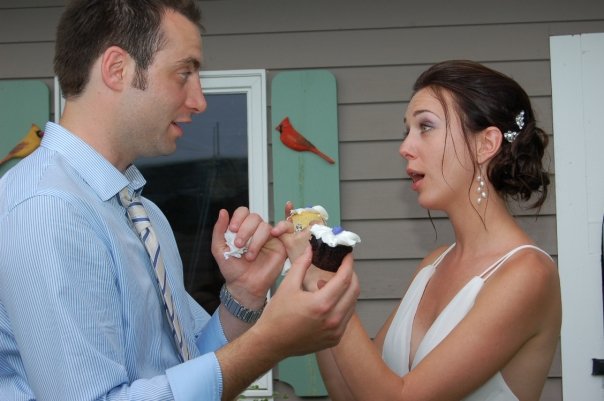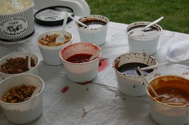 And the best part of the whole day (besides the saying I do thing) was dessert, of course! Not only did we serve cupcakes from a local bakery, but we also had a sundae bar with ice cream and toppings from a local dairy farm, Peaceful Meadows. We shared our first kiss at Peaceful Meadows on a rainy evening (go ahead, say it, you know you want to: awwwwwww). The sundae bar was delivered during dinner, so when the two delivery people showed up in their bright pink Peaceful Meadows shirts loaded down with ice cream, everyone cheered.