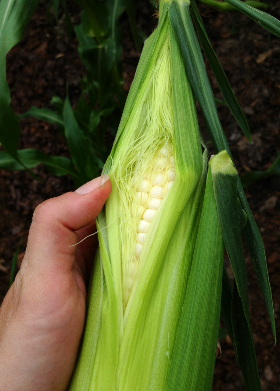After pulling a few weeds (including poison ivy) from around the blueberry bushes, I checked in on the corn stalks. John and I picked a few ears for my supper.