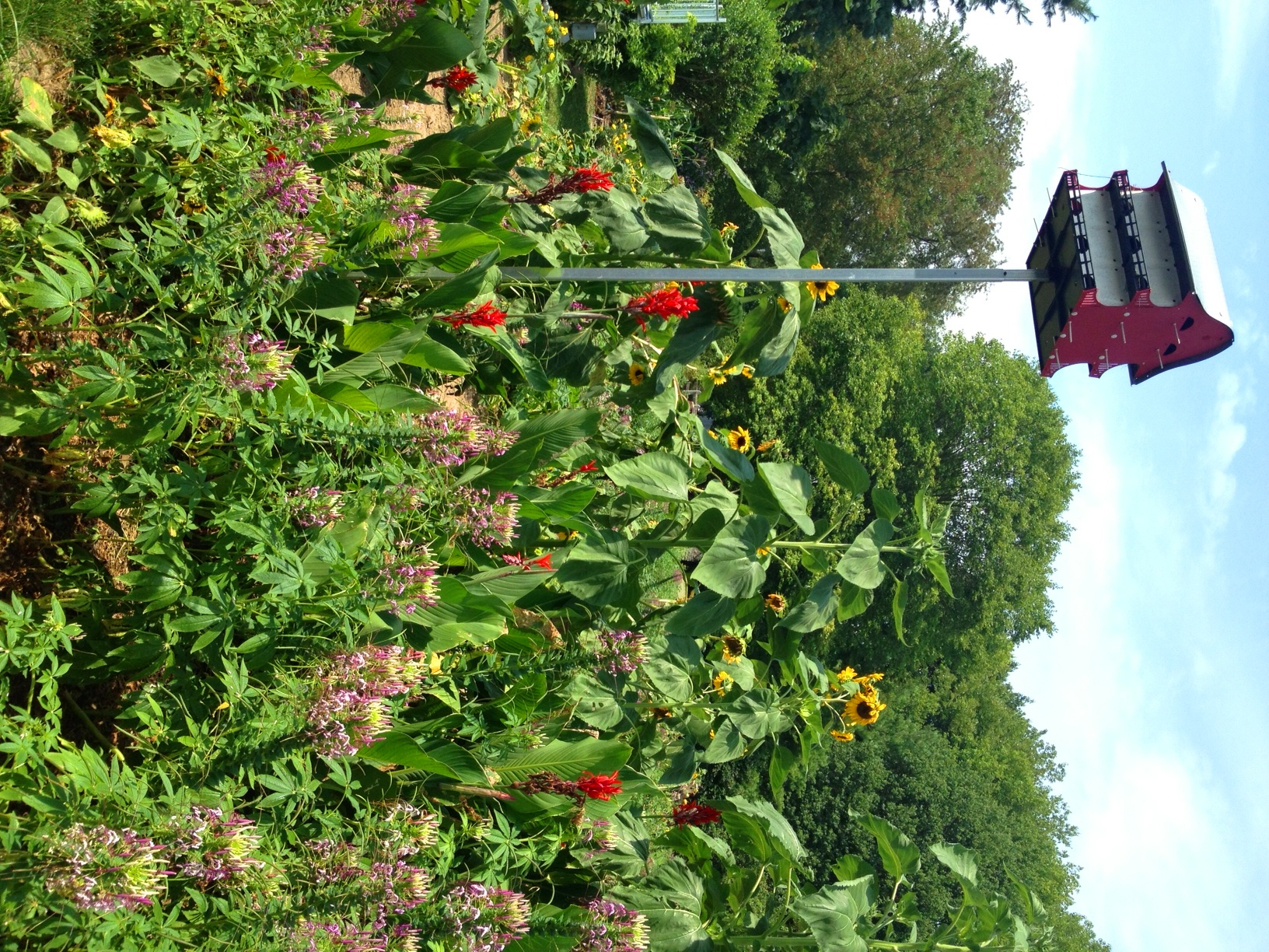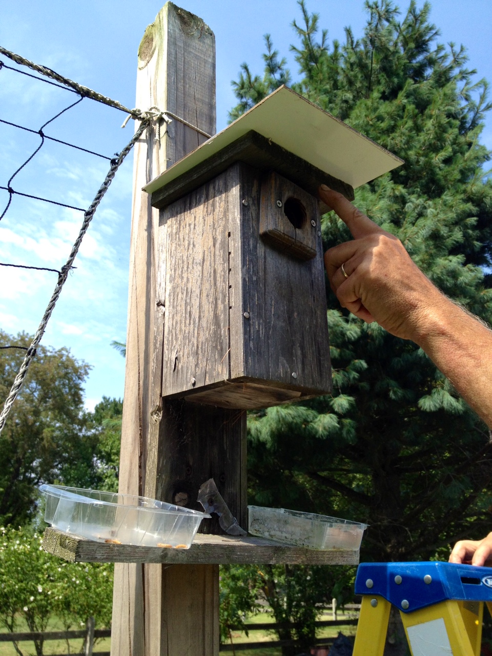 Because the garden changed so much in my absence, John took me on a tour. I snapped some photos with my iPhone to share. First we stopped at the blue bird house. The baby birds flew the coop! But a new family moved in to the house across from the corn stalks. John, ever the attentive landlord, gave them a new roof to keep out the rain.