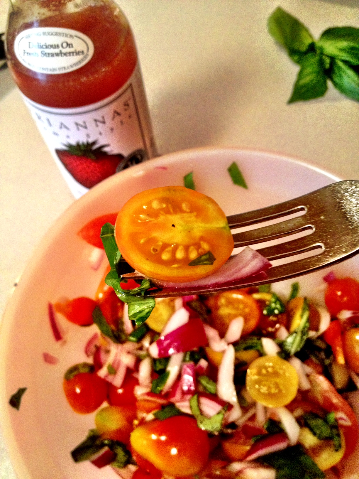 Suddenly everything became clear. I was destined to make a summer salad with tomato, basil, red onion, and Texas salad dressing. The sweet and tangy taste of the vinaigrette was a perfect match for the candy-sweet tomatoes and fresh basil.