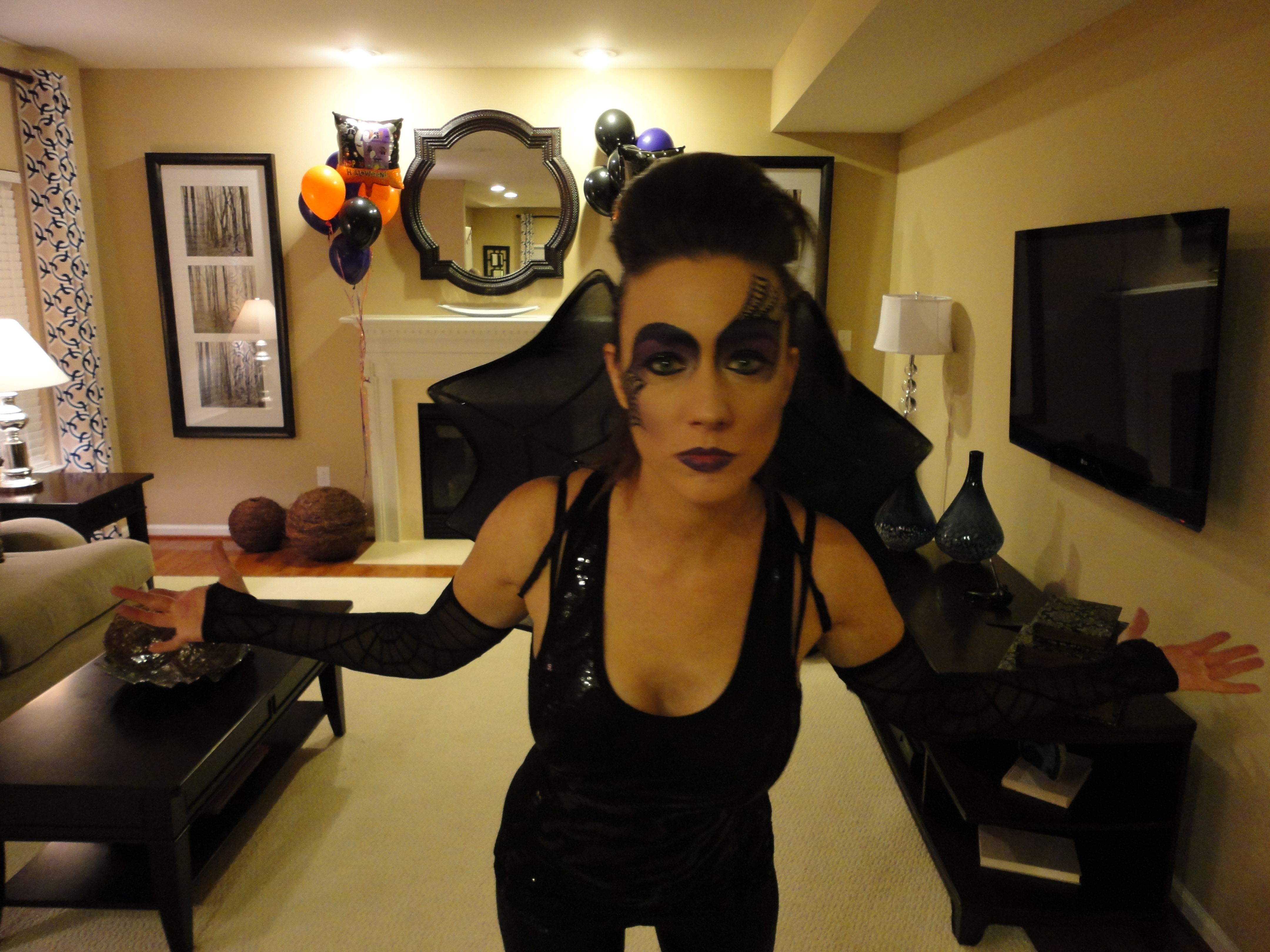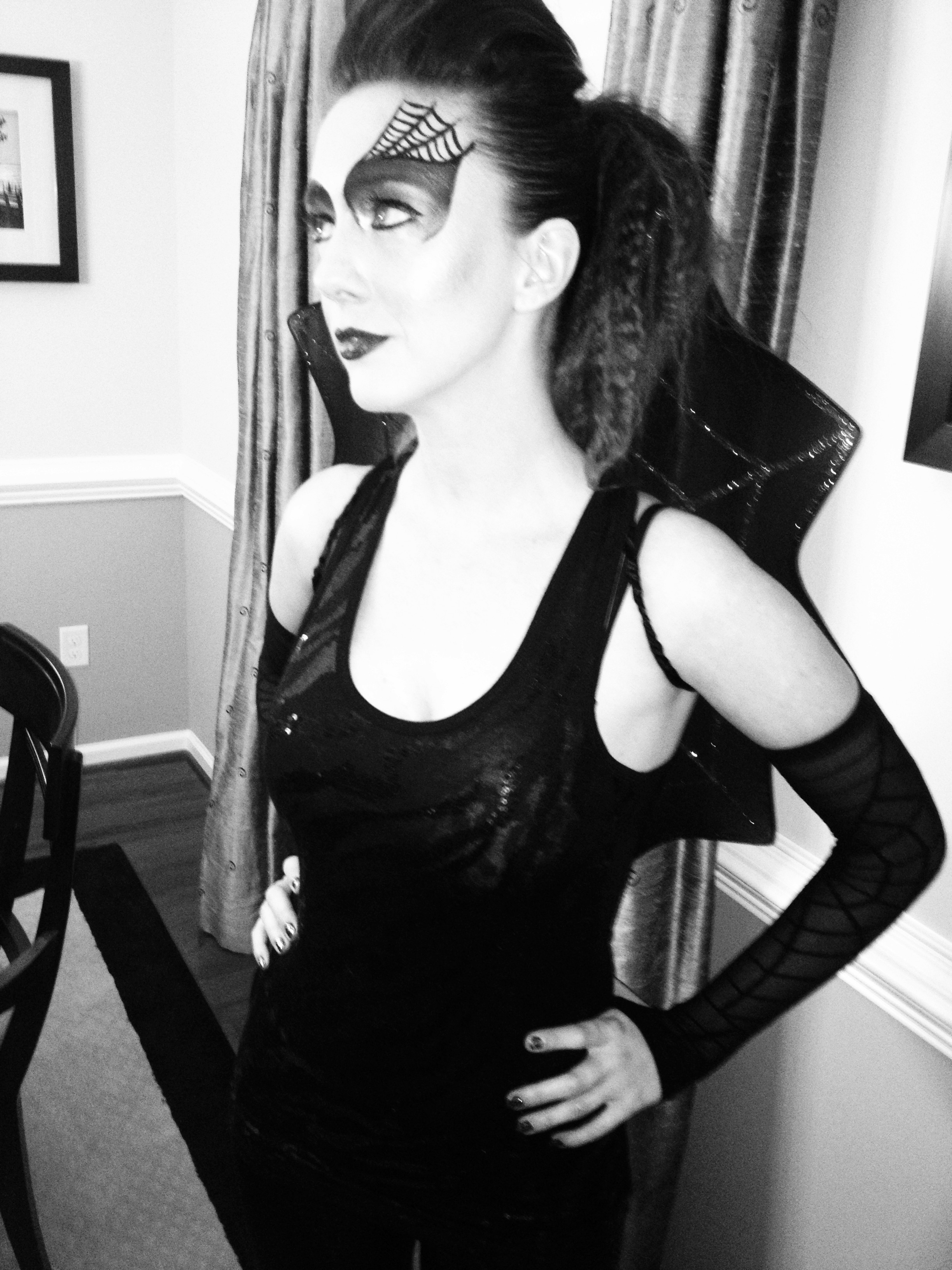 Seeing as it was the Monday before the party I was relieved. Something about this costume just felt right. Searching Amazon again, I ordered spider web “arm warmers” and cob web wings (they arrived next day thanks to my Prime membership). Adding those accessories to shiny black pants, a sparkly tank top, and tall black boots, my villainous spider costume was born and a very important decision made.
