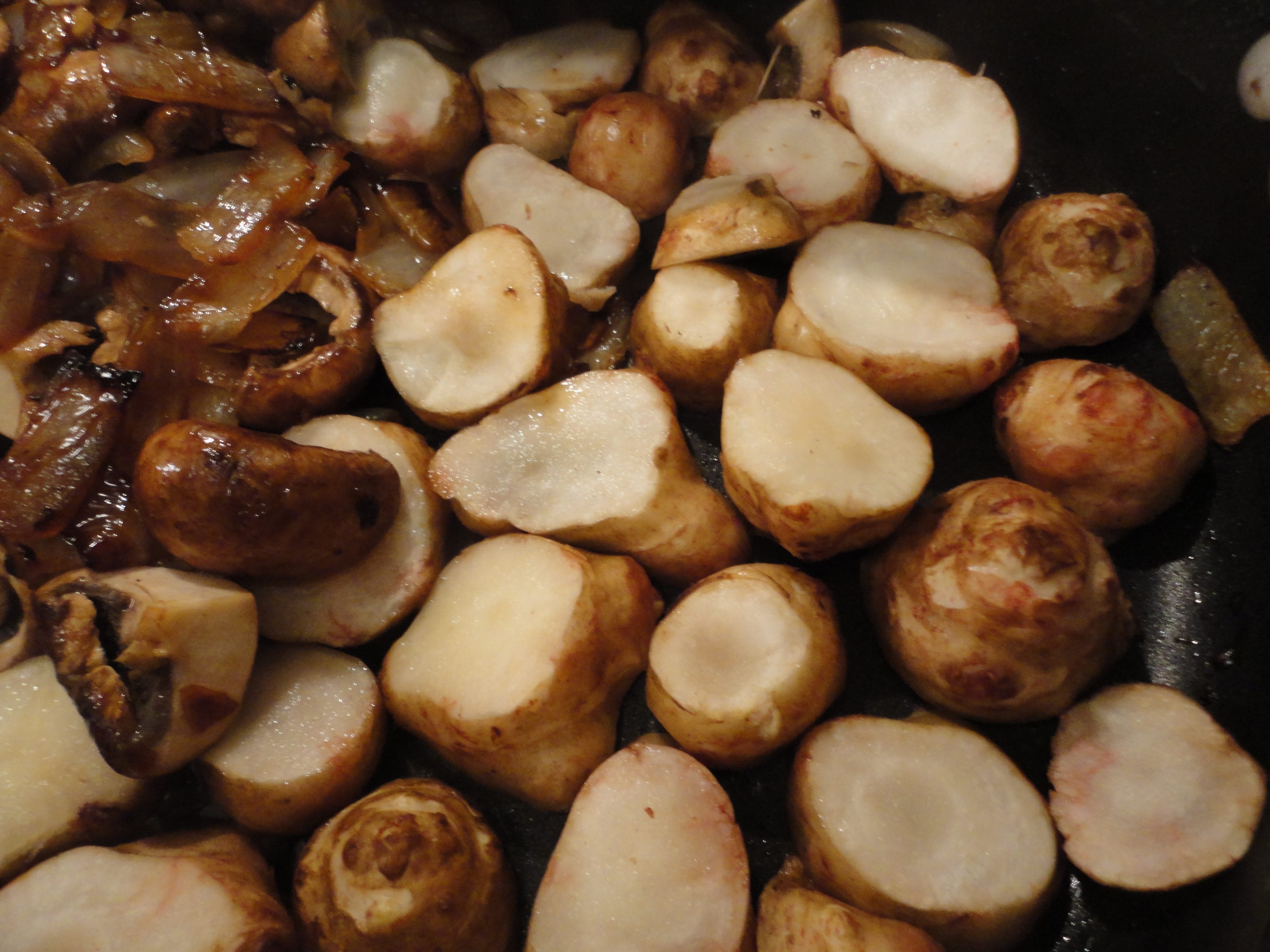 When the onions are brown and melting, add the garlic. Push the onions aside and add the mushrooms, allowing them to brown in the pan. Push the mushrooms and onions aside and add the Jerusalem artichokes. Let them brown a bit too.
