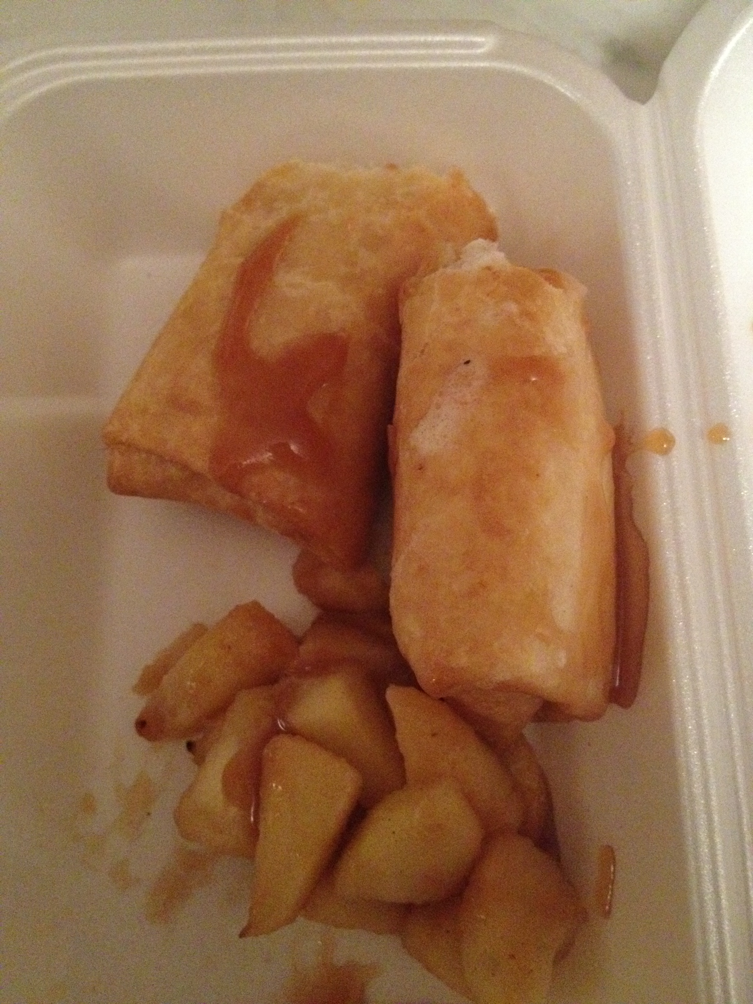 The egg roll is some kind of apple flavored, cheese thing–their version of a turnover. It was gross!!