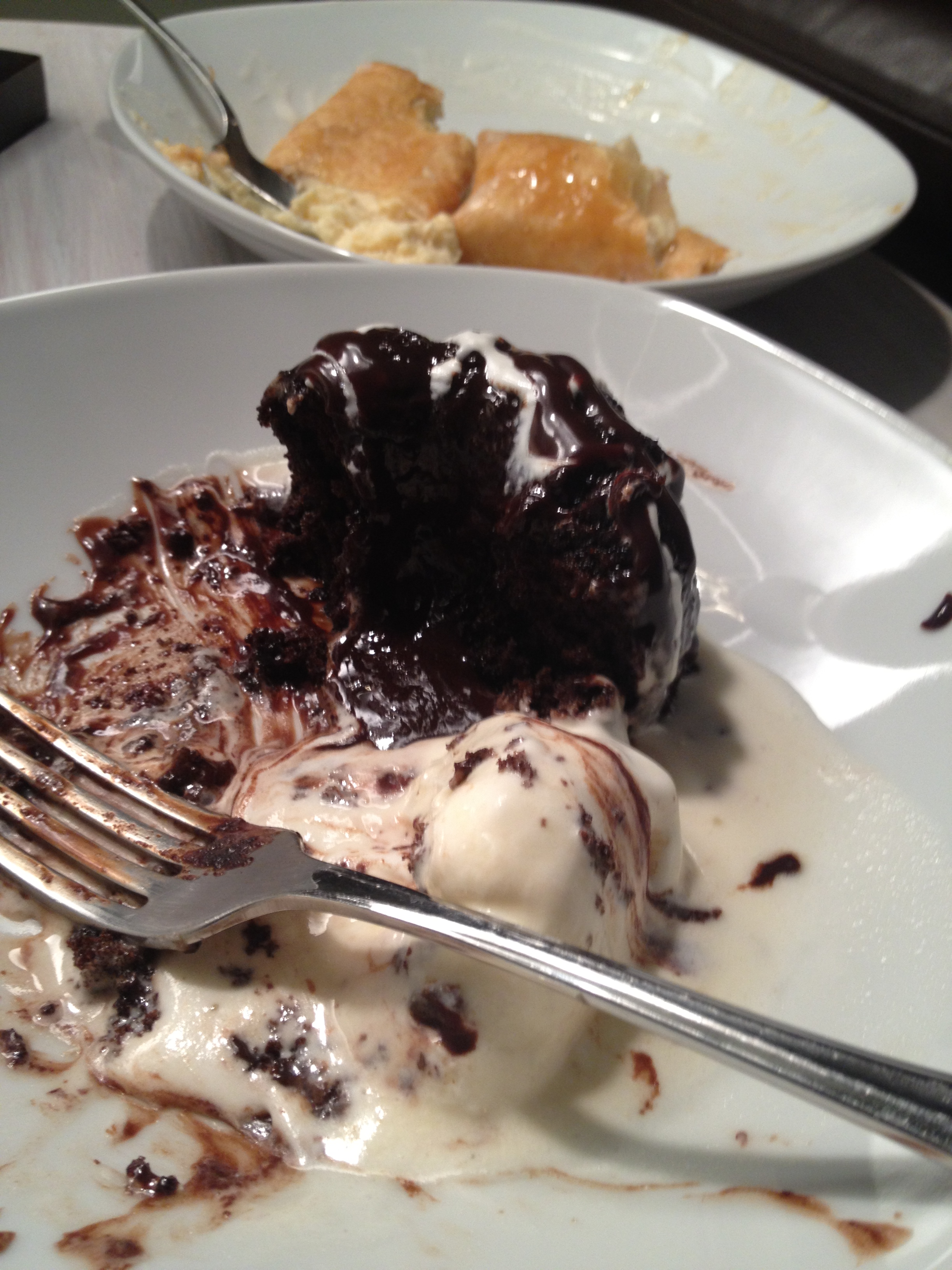 Ha! Oh MAN molten cake is a temptress – Applebee’s is the place I discovered it, too! The PJ bottoms and “just because it’s made at my neighborhood bar and grill” line cracked me up.