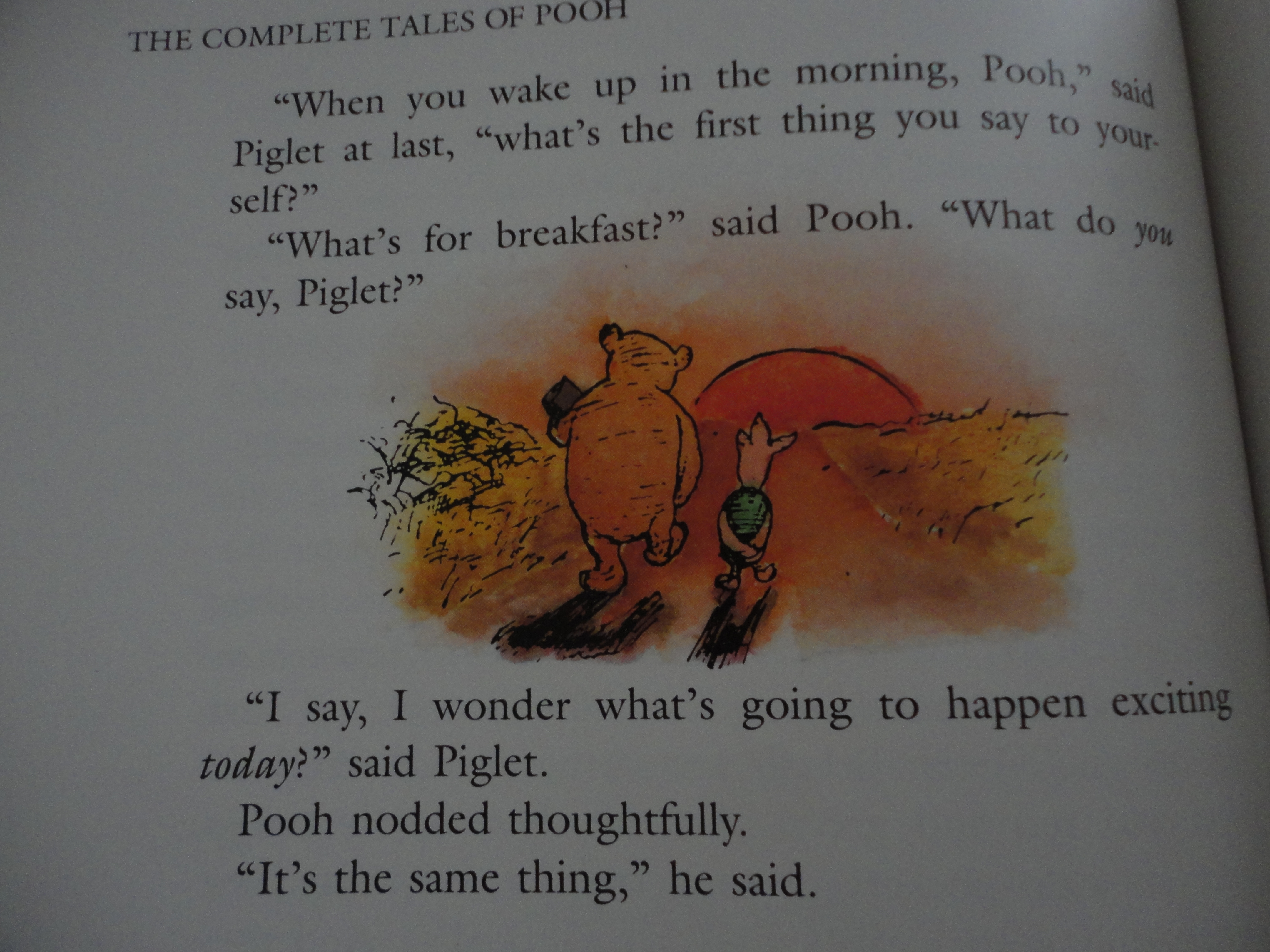 “When you wake up in the morning, Pooh,” said Piglet at last, “What’s the first thing you say to yourself?”
