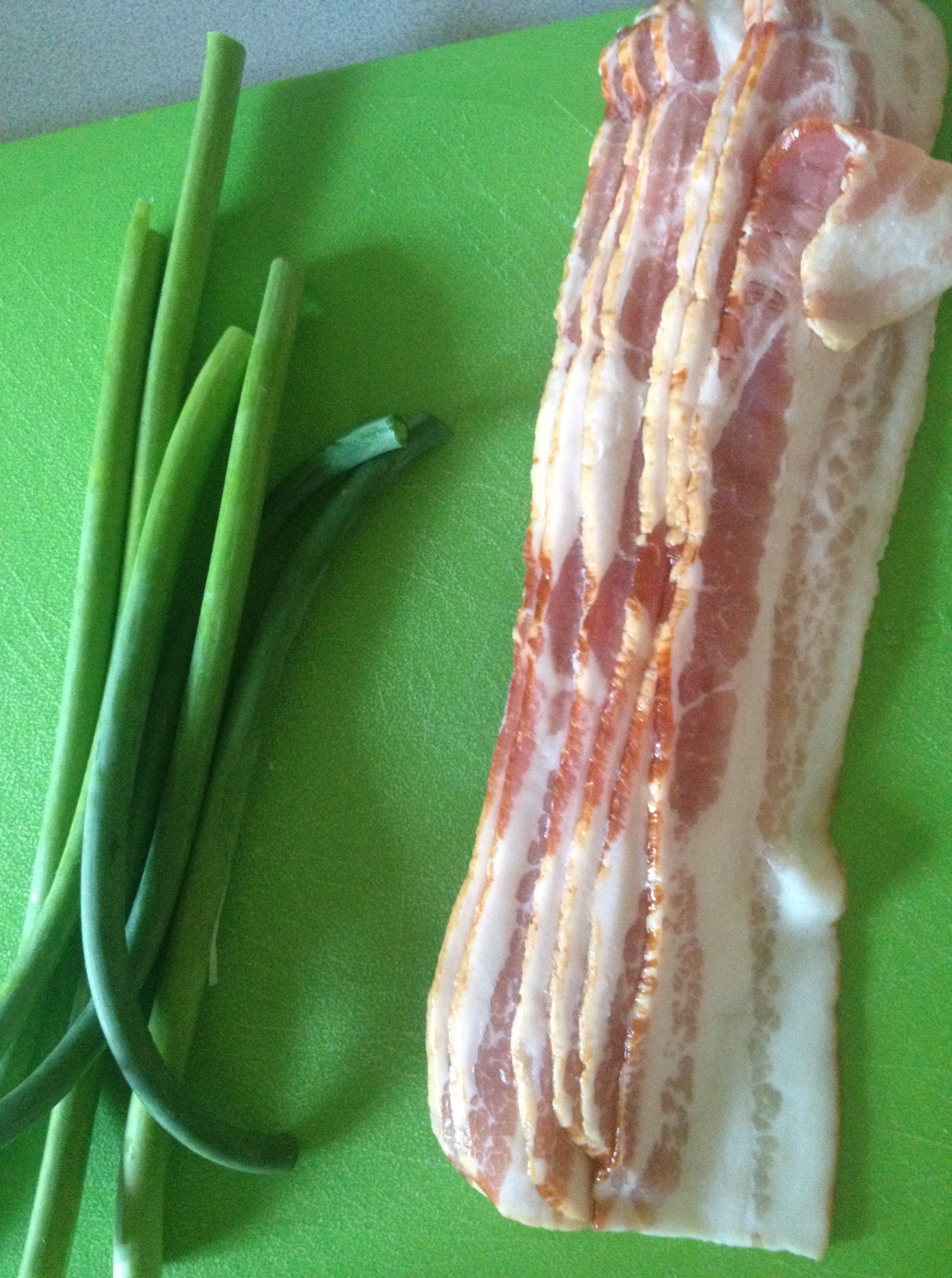 Today I present another combination: garlic scapes and bacon. This is not so much a recipe as two things combining to create magic.