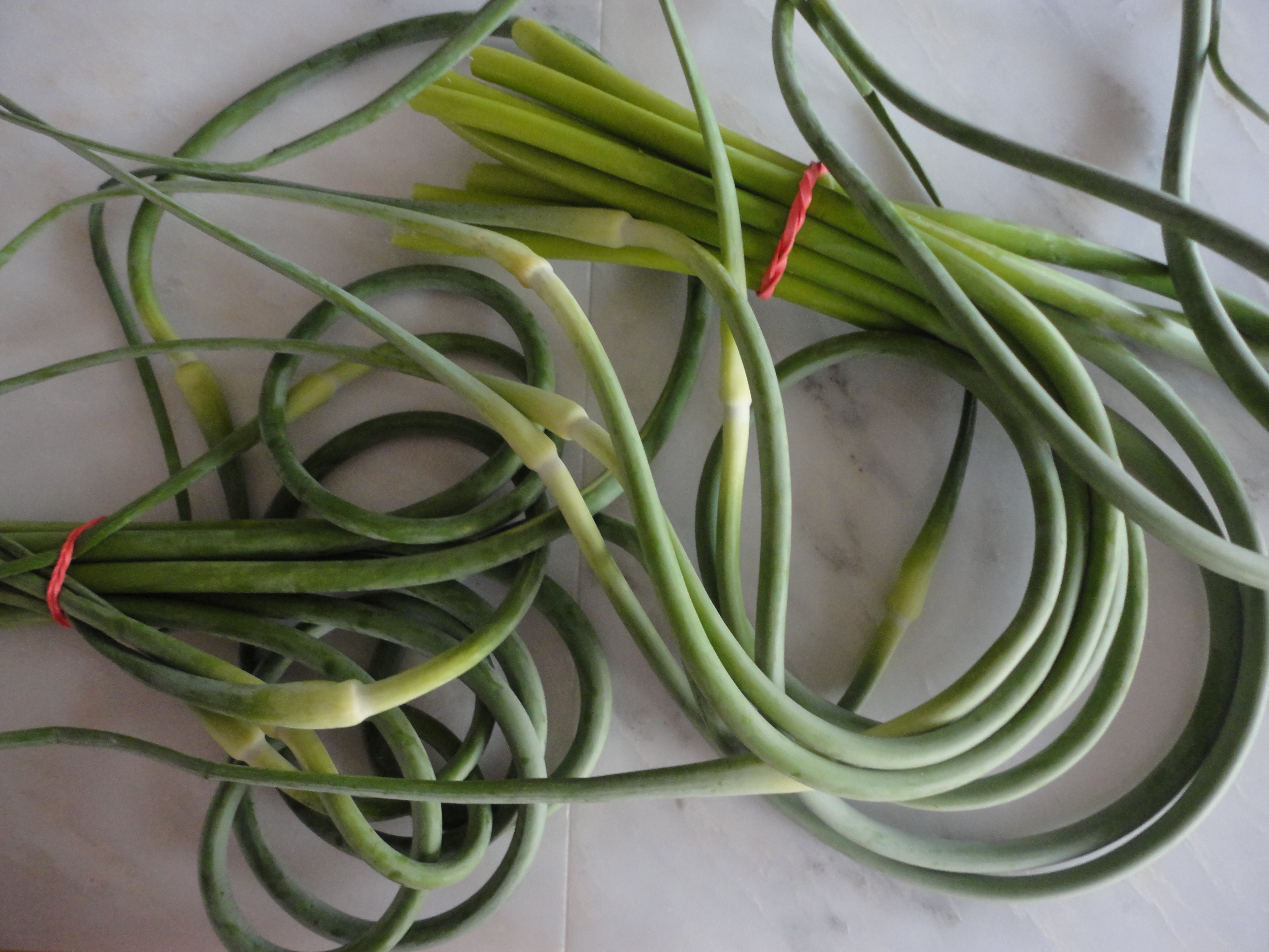 Garlic scapes are usually available in farmers markets – common in these parts this time of year. They are so good.