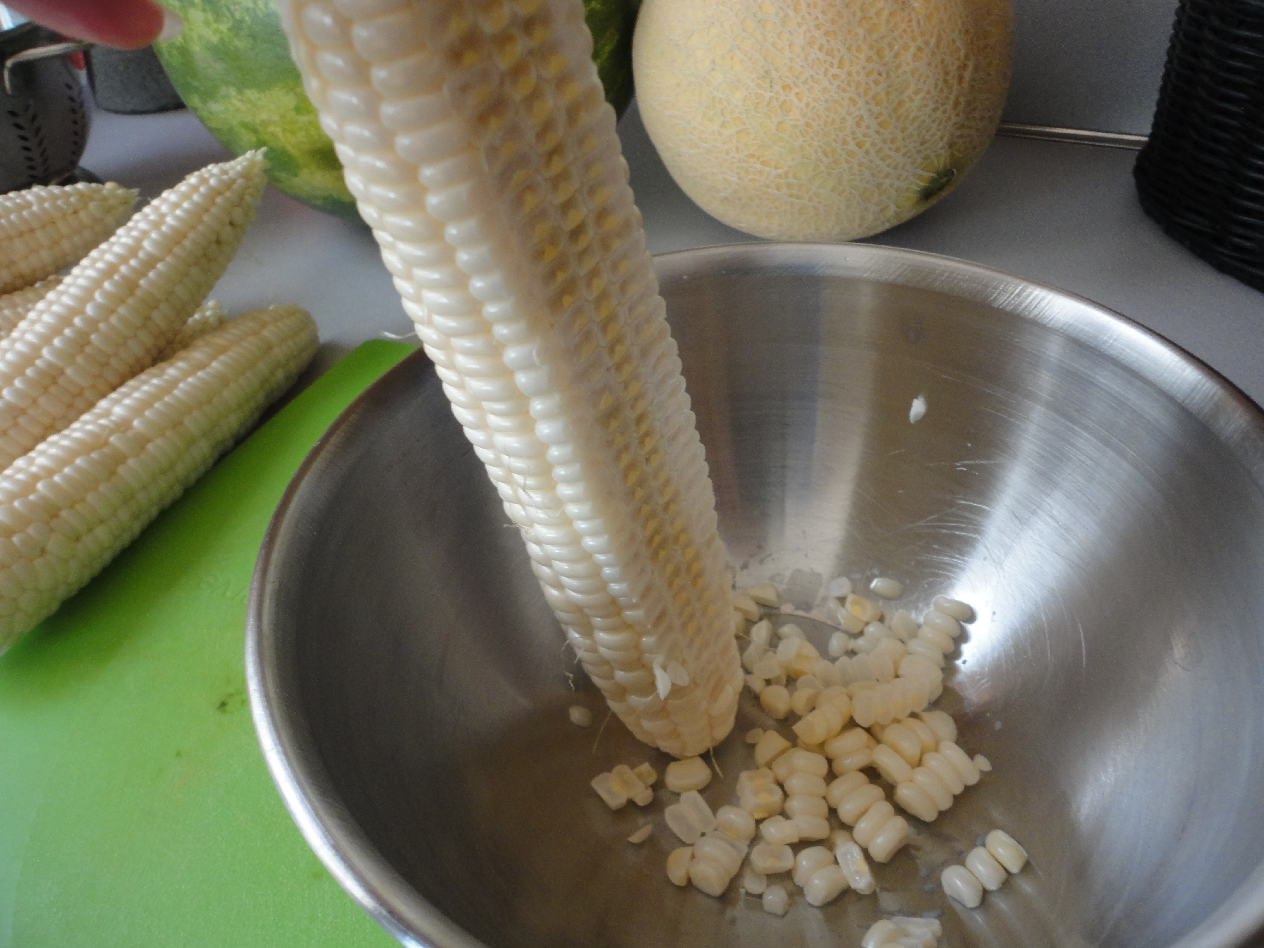 Remove the corn kernels from the cob with a knife (make life easier and do this in a bowl).