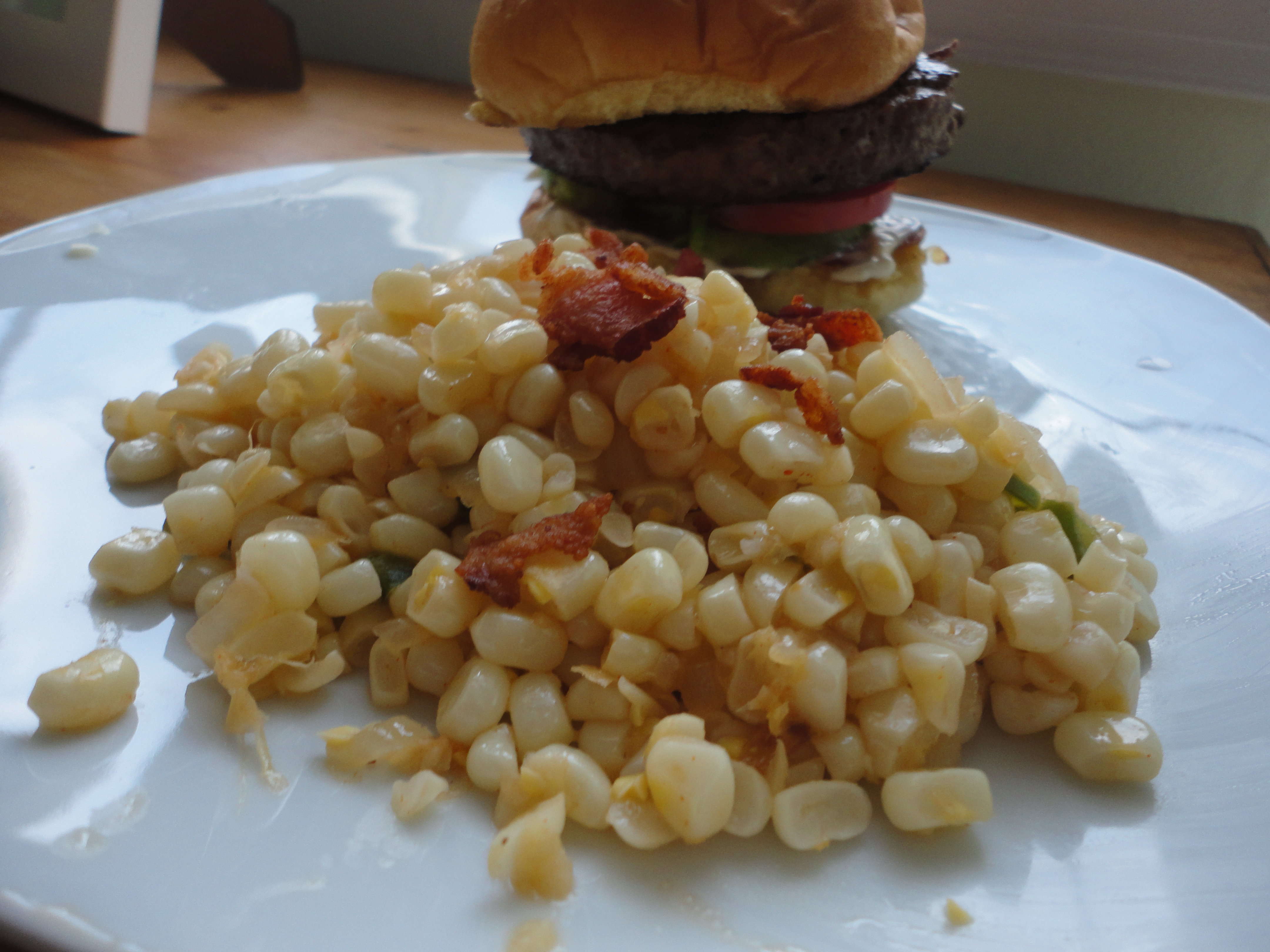 Remove corn from heat, add the lime juice, and check for seasoning.  Add more salt if necessary. Transfer to a serving bowl or plates and garnish with the bacon and cilantro. Serves 6 as a side dish.