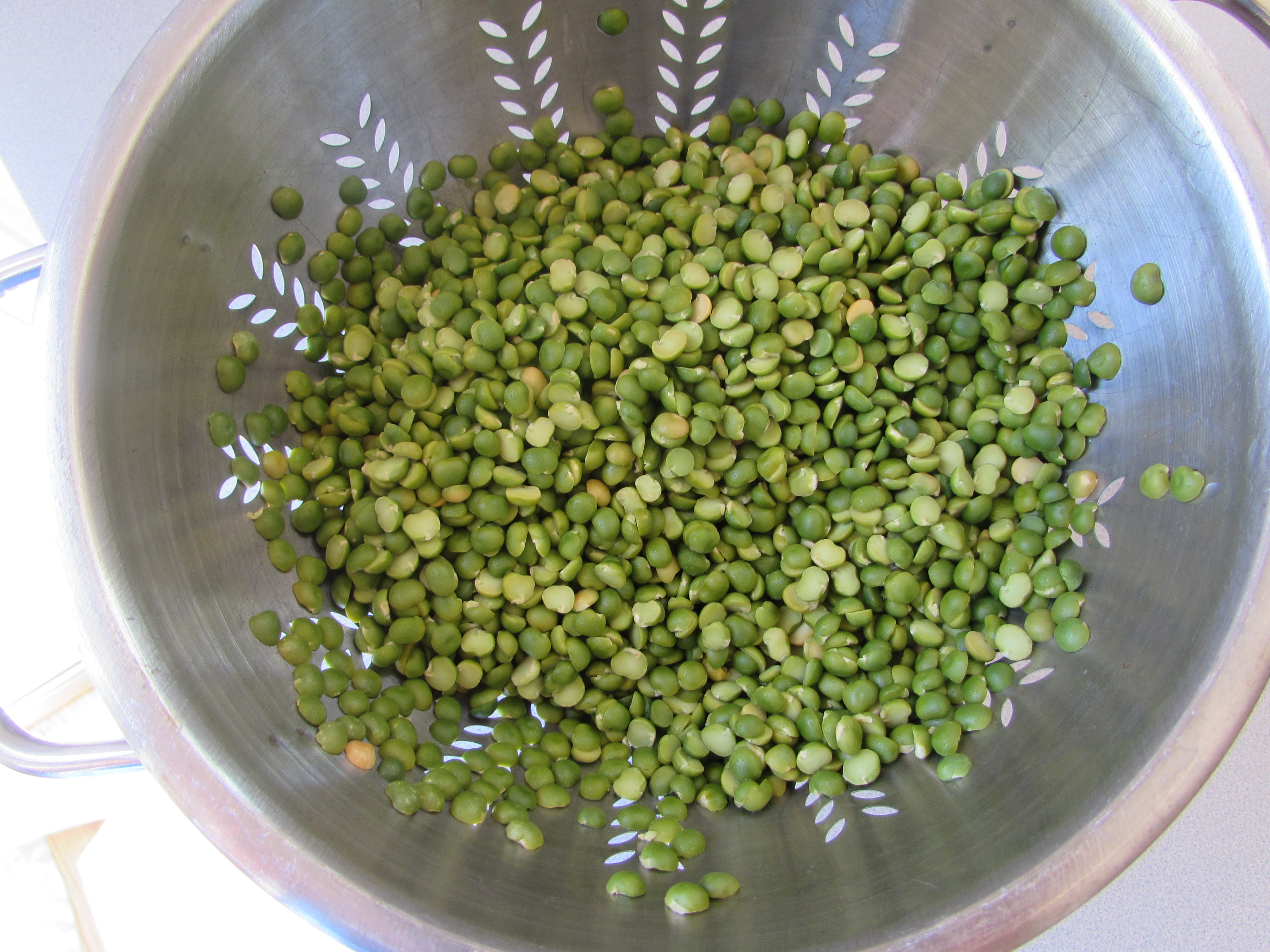 While watching reruns of the aforementioned Downton Abbey I noticed Daisy, the scullery maid shelling peas. “Peas!” I thought. “What a quintessential spring ingredient! I would love some bright green pea soup with a dollop of creme fraiche right now.” Upon perusing my own kitchen, I was disappointed in my options. Not only was my pantry devoid of a butler, it also had no fresh spring peas. However, I did find dried split peas.