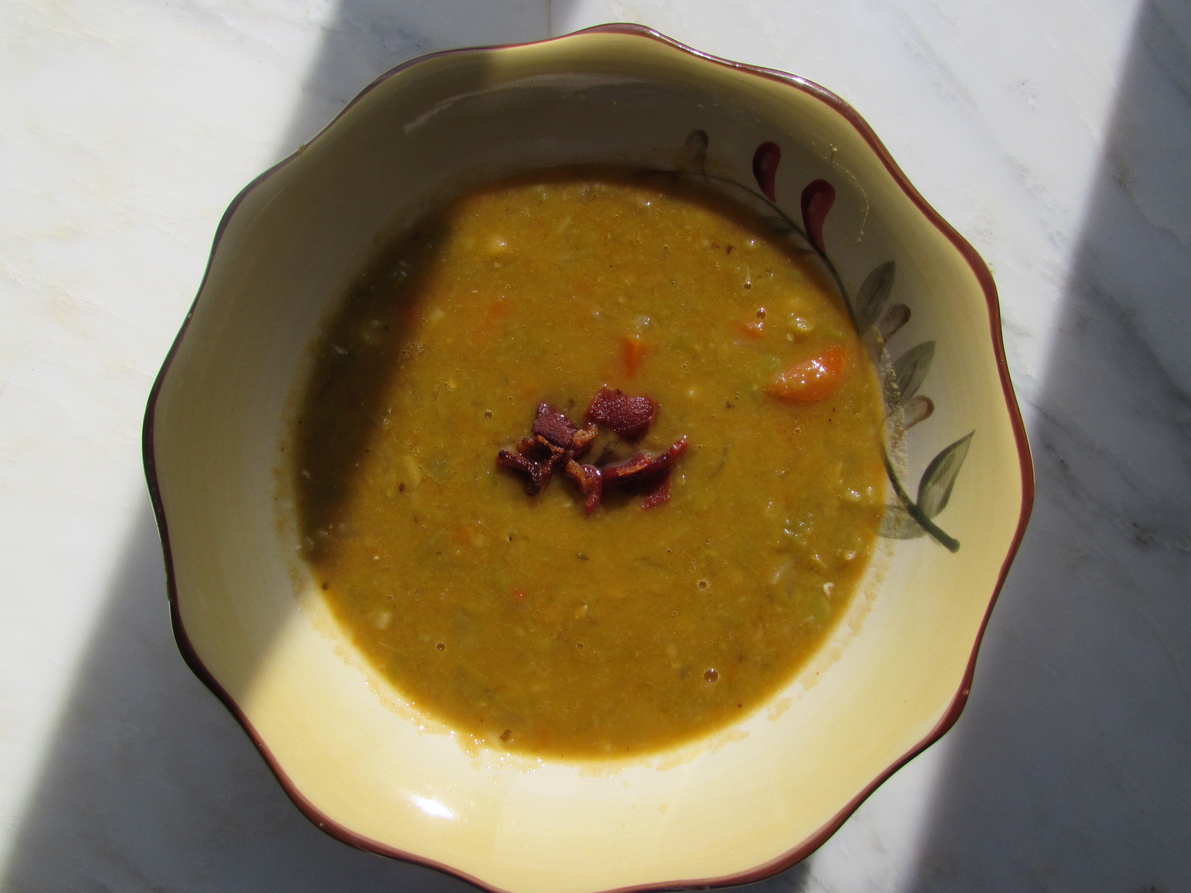I attempted to make a healthy, vegan split pea soup with local carrots and parsnips, but once I realized I had a slab of bacon in the fridge, I got completely sidetracked. Before I knew it, bacon sizzled in the bottom of my soup pot, enhancing the flavor of this smoky soup. How could I resist?